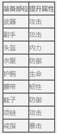 不同部位的装备,升星后加成的属性也不尽相同,详见下列表格: