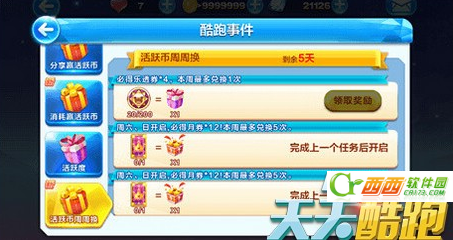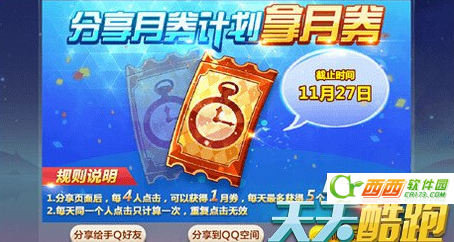 月券是通过活跃币来兑换乐透券,最后通过乐透券来兑换礼盒得到。每50个活跃币相当于可以获得12张月券。月券计划是分为多个阶段来获得活跃币的,每一个阶段都会包括登陆获得活跃币,分享获得活跃币,消耗获得活跃币还有完成任务获得活跃币的活动。每一个阶段的获得活跃币的酷跑时间与任务都是有时间限制的。