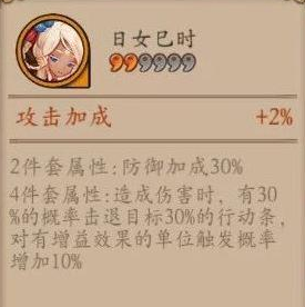 日女巳时2件增加防御,4件可以击退对方行动条,有增益效果单位触发击退效果概率更高。