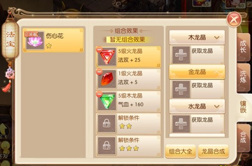 法宝是玩家达到60级后解锁的玩法,能够镶嵌的道具名为龙晶,可以为玩家加成额外属性,目前开放的龙晶有木、金、水、火、土、风六种属性,等级分为1级到6级,等级越高,加成属性越多。