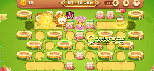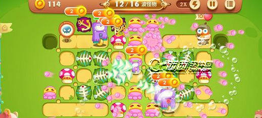 3.用章鱼和宠物技能,很快我们就能将章鱼周围的障碍物清除,继续如上图一样放章鱼,在船锚下方放一个蘑菇减速。