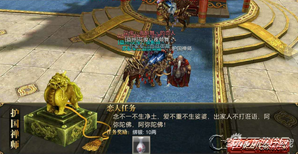 西西跟恋人的第三个任务依然是对话任务,需要找到护国寺老禅师进行对话。作为队长的西西带着自己的恋人找护国寺老头,对话结束后,护国寺老禅师也是给了奖励,绑银10两,一级桃子酒一个,虽然没有貂蝉的好,但是也不错吧。
