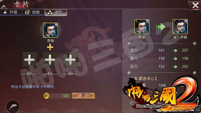 进阶条件——武将卡在进阶为鬼、神时需要相应等级才能进行进阶,作为祭品的卡片无等级要求,但需要与主卡相同的层级(真、鬼、神)与品质(金卡、银卡、黑卡、白卡);值得注意的是,只能用同品质的卡片作为祭品(即,金卡只能用金卡作为祭品)