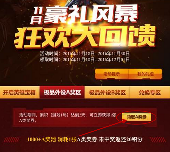 进入豪礼风暴活动也后,点击极品外设A奖区,可以看到有领取“A奖券”的字样,这里可以领取15次,共300积分。