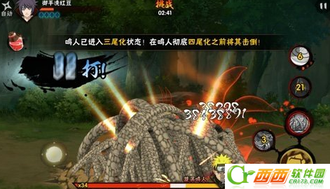 所以玩家需要在限定的形势下,对鸣人造成致命的伤害,一旦失败——鸣人四尾全部爆出,即宣告通关失败。并且本关并没有金币复活的环节,所以玩家只能保证自己一次性通关。