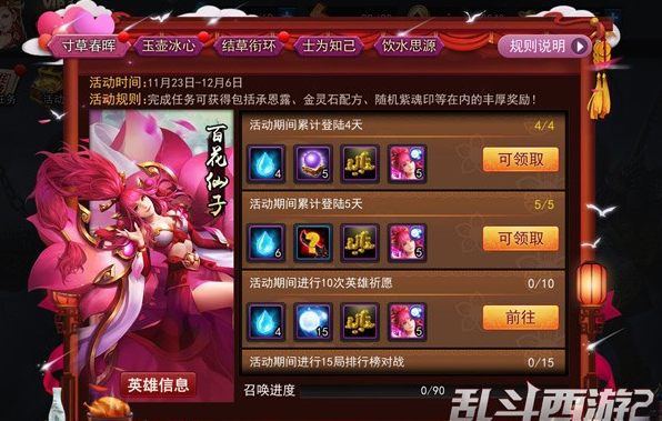 完成任务可获得包括全新三星英雄百花仙子、金灵石配方、随机紫魂印等在内的丰厚奖励!