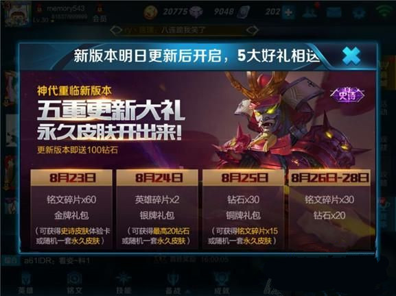 11月24日,强更首日登录即送铭文碎片*60+金牌礼包(打开获得史诗以上皮肤体验卡或永久英雄/皮肤,包含30W个永久英雄和20W个永久皮肤)