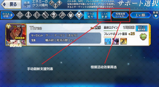 从你的好友列表中选择你想要使用的好友,这个支援是必须选择的。如果是已经成为你好友的玩家,从者信息框的右方会出现友情符号,宝具文字也会呈现白色字体。如果并非好友的玩家则不会有友情符号,宝具文字会呈现灰色字体。如果选择并非好友玩家的从者作为自己的支援,在战斗中就无法使用该从者的宝具。