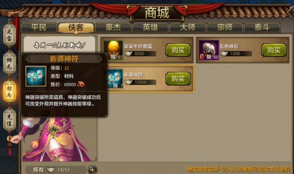 神器突破需要道具新莽神符。新莽神符在游戏中的获取途径比较少,属于比较珍贵的道具。首先是开服的江湖之路活动中可以获得一些。然后就是每天的燕子坞副本会有一定几率掉落。