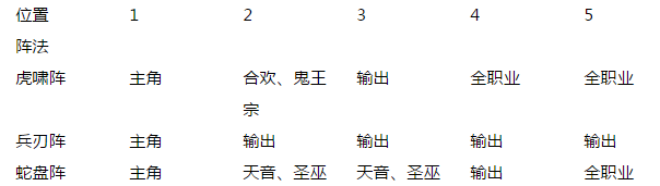 阵法分析:合欢与鬼王宗都是物理攻击职业,所以选择1号位增加伤害或是物伤的阵法,阵法中虎啸阵、兵刃阵和蛇盘阵都是不错的选择。虎啸阵和蛇盘阵适合仙侣都是输出的阵容,区别是虎啸阵是1号位增加输出能力更高,兵刃阵是所有位置伤害加成更均衡;而蛇盘阵则更适合存在于仙侣中有圣巫或天音的阵容,2、3号位能提高圣巫与天音的生存能力。