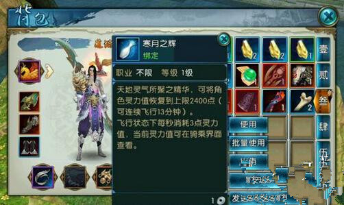 我们可以从这个隐藏任务中获得一个可以用来恢复法宝飞行需要用到的灵力道具寒月之辉,我们在使用以后,可以让我们的法宝灵力值提升到2400点!
