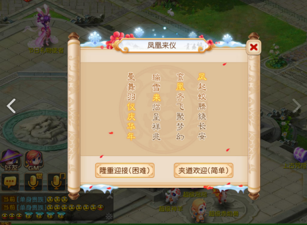 得知冰凤凰凤若雪前来道贺,唐王龙颜大悦,号召三界侠士前往迎接,以武会友。武会设有简单和困难两种难度,三界侠士们可以选择适合自己的难度挑战,当然先挑战了简单难度再挑战困难难度,挑战胜利后也会补足差额奖励的哦!