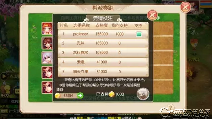 每天12:40和下午的19:40的帮派赛跑大家尽量也要参加,挂机每分钟都有一千多经验拿,如果猜中第一的话,还能获得3倍的金币奖励,失败也有80%的金币补偿,最近西西连续三次成为赛跑选手,已经被帮里的兄弟们深深唾弃了......纷纷要我还他们金币,就算是我自己都已经不押自己了。