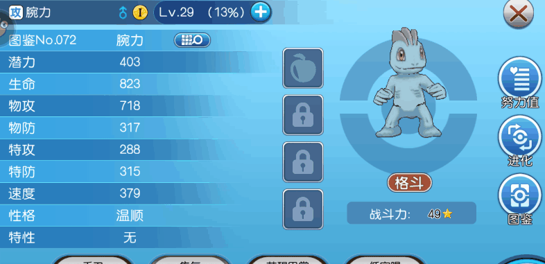 这只是个凯西的例子,还有腕力同样如此,腕力物攻80点,生命70点,物防50点,首选自然是这三项个体较高的腕力,性格话首选固执,调皮,然后开朗
