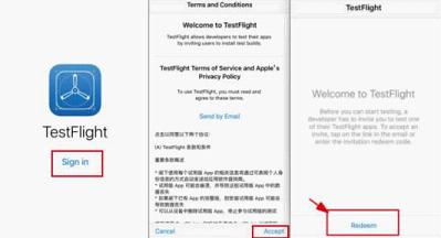 4、打开手机上已经安装好的 TestFlight,选择正下方“Redeem”按钮,输入从邮件中获取得到的兑换码