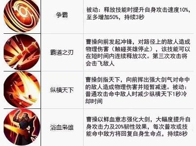◆新版本中的曹操有了不少改变,被动释放技能后能提升自身的攻击速度,1技能的三段攻击很快就能把被动攒起来。单对单对拼非常强力,但是比较害怕控制。对拼和打团时都应该观察清楚对面的控制技能,再进行切入哦!