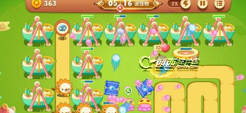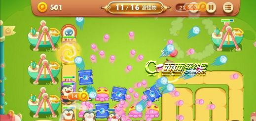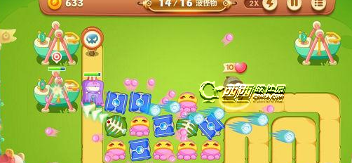 3.接着在空处再放两个章鱼和一个冰锥,依次升满级这些炮塔,还是继续攻击障碍物。