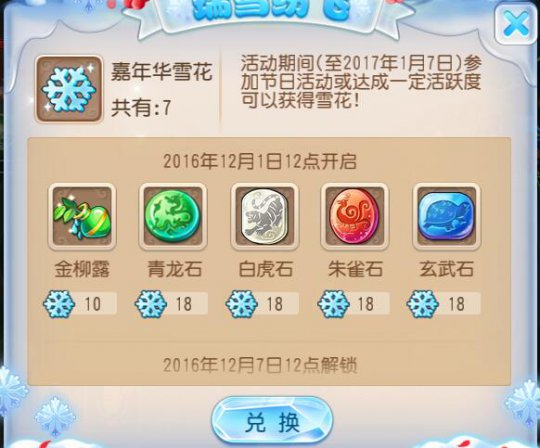 首先嘉年华活动是分为5个环节的,现在才进行到第一阶段欢天雪地,后面雪上乐园、圣诞狂欢、元旦迎福、腊八祭灶活动都是不一样的,不过相同的是都可以获得嘉年华雪花。