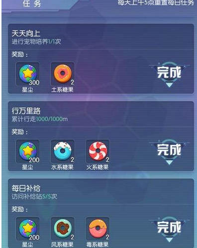 行万里路,每日补给,勤奋猎手等日常任务完成后会奖励糖果。