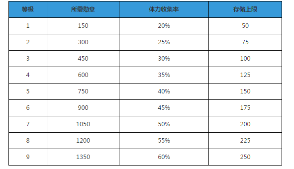 1级收集率20%,逐级增加5%,满级60%;1级储存体力上限50,逐级增加25,满级250