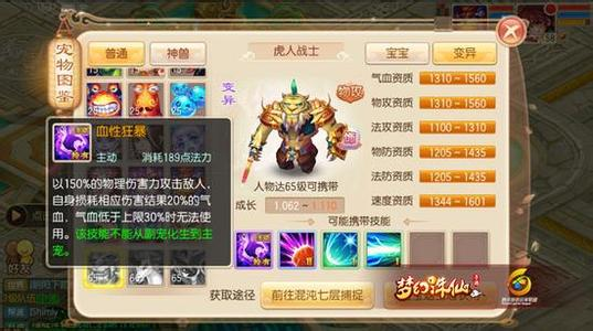 在普通宠物中,从65级的虎人战士和冰灵兽开始,就拥有了主动的特有技能,特有技能是独一无二的,无法从副宠化生到主宠上。虎人战士的特有技能是血性狂暴,血性狂暴以150%的物理伤害攻击敌人,自身耗损相应伤害结果20%的气血,气血低于上限30%时无法使用。魔兽青龙和神兽小灰也有血性狂暴技能,虎人战士的血性狂暴技能效果和青龙的一样,比起小灰在自身耗血和气血上限的要求上要略差一点。