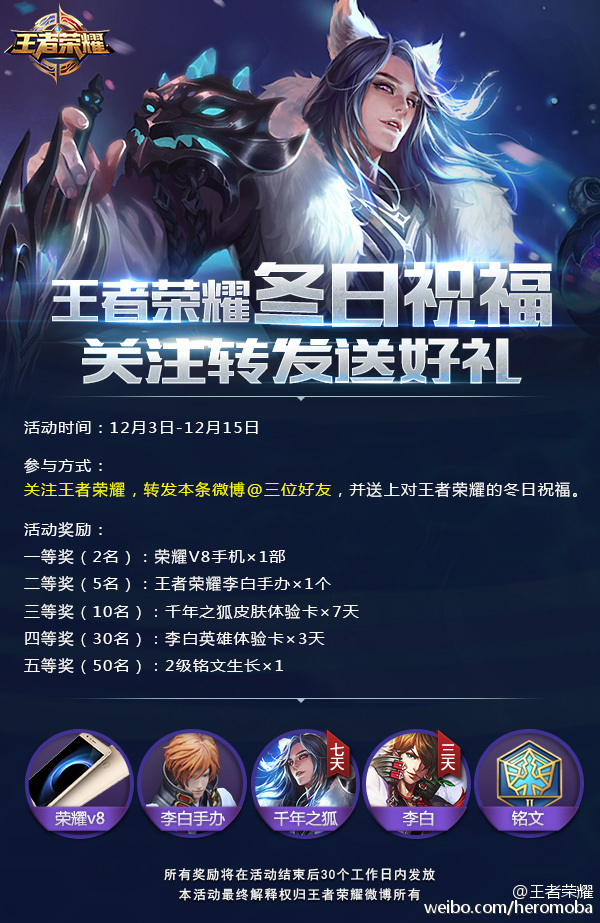 参与方式:关注新浪微博@王者荣耀,转发微博并@三位好友送上对王者荣耀的冬日祝福,就有可能获得以下大礼哦。