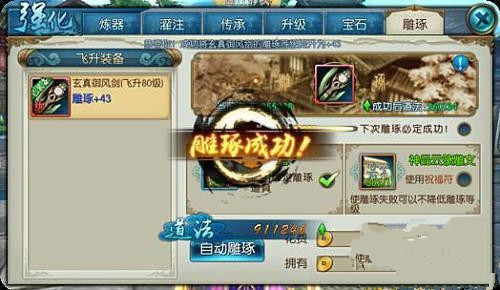 飞升后装备可以进行雕琢,从而大幅度的提升各项属性。