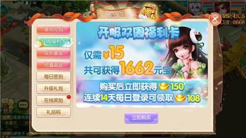 每日赠送:第一天立即赠送150元宝,后期13天每天赠送108元宝