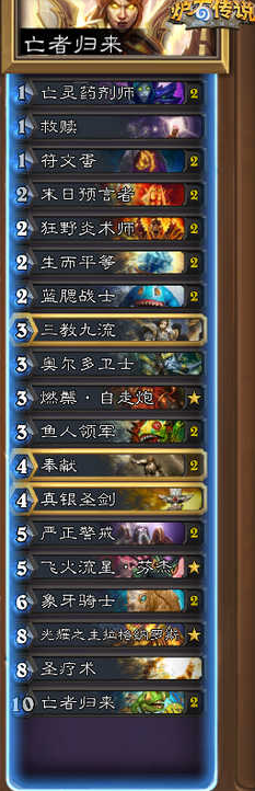 三教九流:我曾经开过一个帖子专门讨论这张卡,目前来看,大规模定向抽滤的强度非常高,在目前环境下几乎所有骑士卡组都可以考虑双药剂师双亡语过牌(符文蛋/海象人)单三教九流的组合,而8张1费+双三教九流则会成为骑士超速卡组的标配。