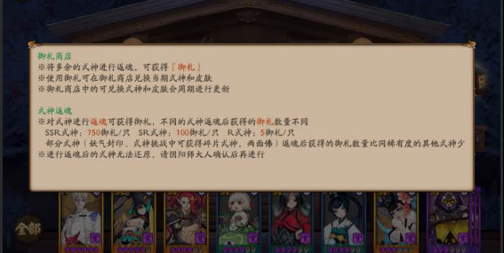 R卡返魂获得5御礼,SR卡返魂获得100御礼(妖气封印刷出来的只能兑换5)SSR卡返魂获得750御礼(两面佛只有五百)。