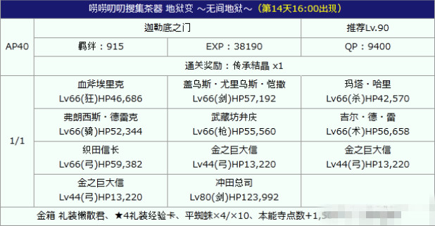 4:无间地狱副本最困难的地方在于:黄金天国提供的点数有上限,而其他的点数缺口就需要在地狱变里刷,同时无间地狱是最佳刷平蜘蛛的地点,所以就会为了刷材料的同时提升点数,而让自己的队伍里面带上本能寺点数UP的英灵,从而导致自己队伍的强度下降,这也是为什么上面介绍信长的时候说本能寺活动需要能打又增加点数的从者,此副本建议如果自己的UP从者不能稳定刷的话上几个非UP强力从者,上一个非UP从者也只是损失20%点数加成,影响不是很大。