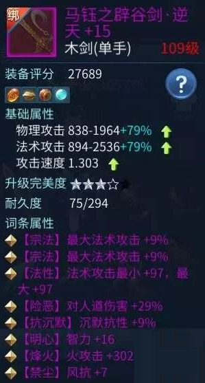 而且我的逆天词条里还有火攻击和智力词条,这样一算,我会选择我现在的逆天双最大18%的武器。(当然,一定不要觉得宗法比无钻好,这个大家要去算,因为更多的时候无钻是会比宗法好的,我这个是特例,希望不要误导你们,这里关键是让大家明白算法。)