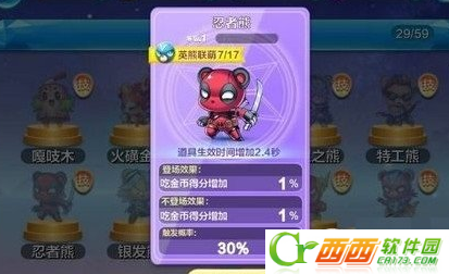 齐天大圣和白龙马这套组合小伙伴们都不陌生,这个组合搭配起来,有个额外的加分--18倍的金币加成!这套装备可以说是当初的第一套爆分装备,靠吃金币的得分非常牛逼,而忍者熊的登场效果:吃金币得分增加800%,这个属性一加入,无疑让这套装备强势觉醒了。