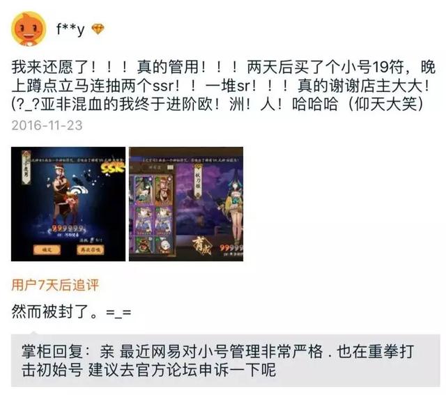 需要解释一下的是,这位朋友是用买来的自抽号(自带十几张券)抽的,而网易对小号的监管的确非常严格,被封也是预料之中
