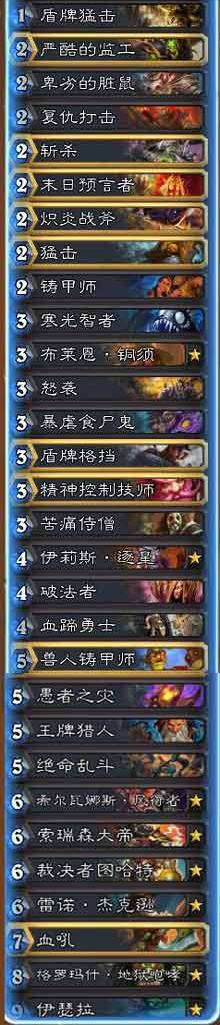 对防战、骑士:基本上对阵控制卡组全是优势对局,爆牌和脏鼠要尽可能发挥大的用处。