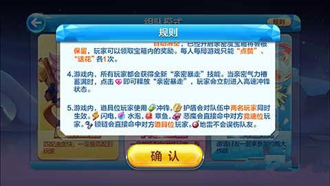 3、两名玩家可以通过互相点赞,送花,合作参与约跑大作战来累计亲密度,亲密度值累计满即可开启亲密度宝箱,当队伍解散时,未累计满亲密度将被自动清空,已经开启亲密度宝箱将会被被保留,玩家可以领宝箱内的奖励,每人每局游戏只能点赞,送花1次。
