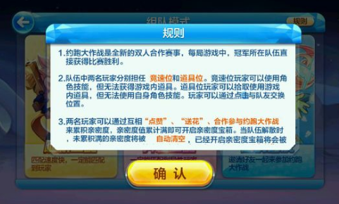 3、两名玩家可以通过互相“点赞”、“送花”、合作参与约跑大作战来累积亲密度,亲密度值累计满即可开启亲密度宝箱。当队伍解散时,未累积满的亲密度将被自动清零,已经开启亲密度宝箱将会被保留,玩家可以领取宝箱内的奖励。每人每局游戏只能“点赞”、“送花”各1次;