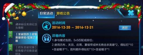 12月20日~12月21日期间,在5V5对战中使用吕布、关羽、庄周、夏侯惇或钟无艳击杀英雄即可获得钻石*10和圣诞帽子*1,若比赛获得胜利,就可以额外再获得10个钻石和1个圣诞帽子。