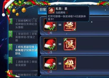 圣诞帽子可以兑换【圣】、【诞】、【快】、【乐】四个字的礼包,分别可以开出钻石或史诗级皮肤体验卡,比如需要圣诞帽子最多的【圣】字礼包就可以开出14天的史诗级皮肤体验卡!