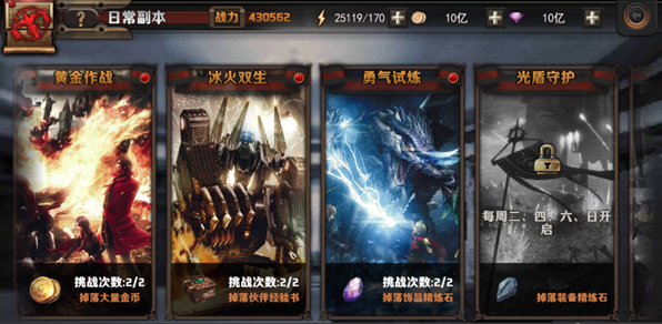 4、日常副本的奖励依次为金币、经验书、装备精炼石、经验饰品、以及饰品精炼石