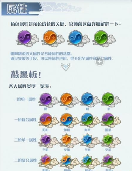 在游戏中主要分为单一属性。就是阴、阳、刚、柔。还有各种复合属性。复合属性比较多。