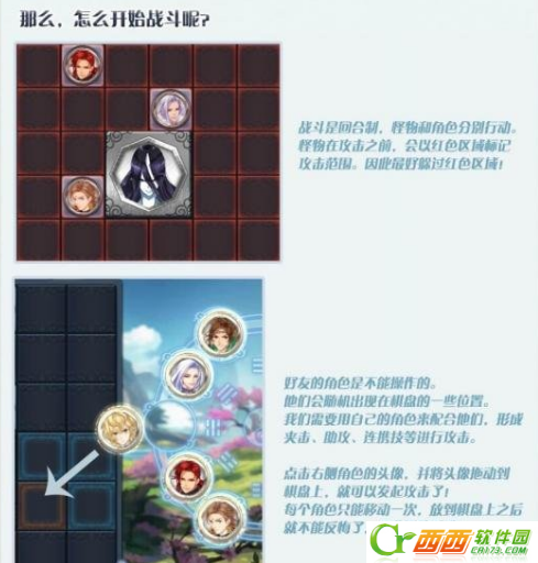 战斗是回合制,怪物和角色分别行动,怪物在攻击之前会以红色区域标记攻击范围,因此最好躲过红色区域。