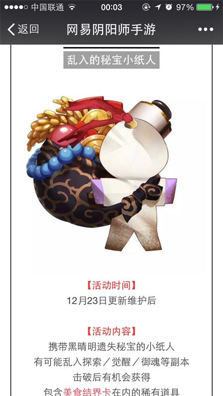携带黑晴明遗失秘宝的小纸人,有可能乱入探索/觉醒/御魂等副本。(在里面遇到这个小纸人的怪记得打掉)