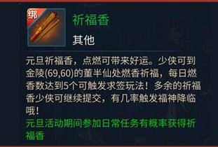 12月29日—1月4日活动期间,参与一条龙、师门任务、重温剧情、关宁校场、帮会大盗、帮会货运、宝图任务,即有机会获得祈福香!可前往金陵董半仙处燃香祈福!