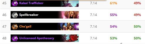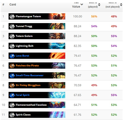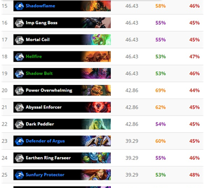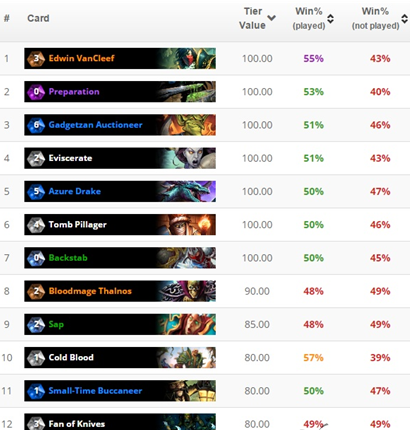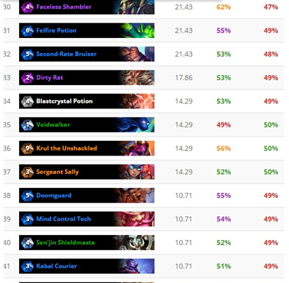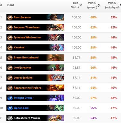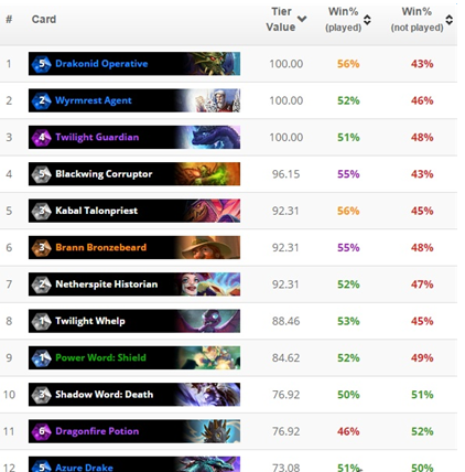 主要以大数据的:打出胜率、未打出胜率来计算,当然也不完全以此评分,也包括了对各类卡组胜率而言,不过全部放出实在太长,就直接截取评分部分、打出胜率、未打出胜率。