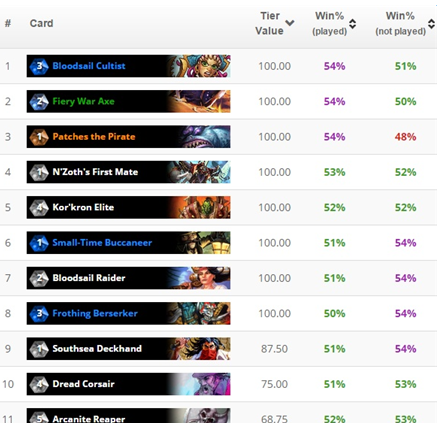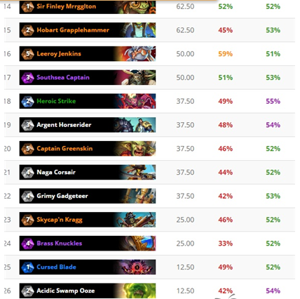老调重弹的海盗战,实际上可变动卡位几乎也不多了。钩锤的效果实测不好导致现在没人带,不过也算测试过的部件有上榜,倒是南海船长的评分只有50,看来纯海盗体系走铺场控制很难,还是拿刀打脸比较快。