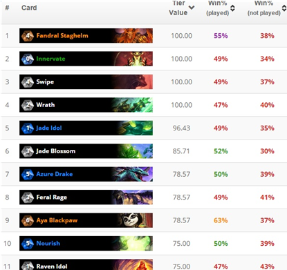 看到勇敢的记者和爆牌鱼,可能有人尝试使用了爆牌青玉德的体系,不过效果看来一般。单卡选择方面奥术巨人正在慢慢退出德鲁伊的舞台,就连加基森也不过排在15位左右,法系为主的德鲁伊的各种法术倒是名列前茅。