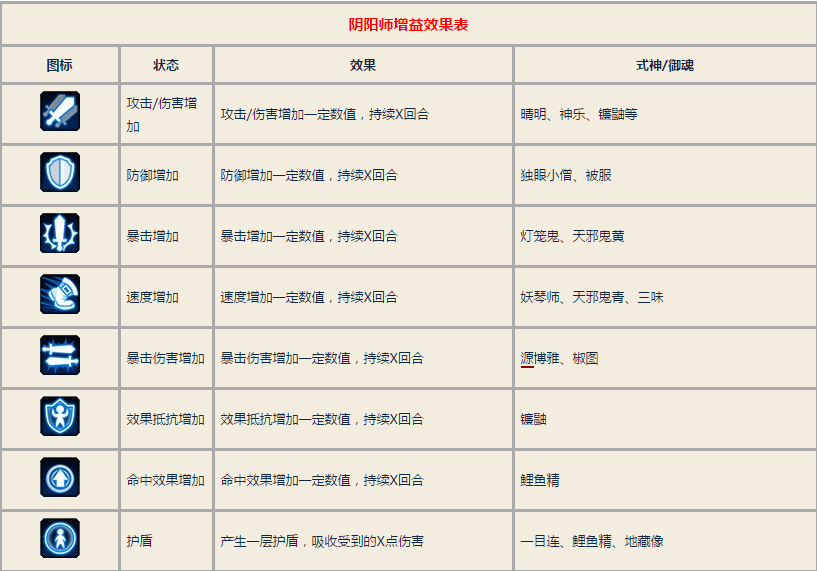阴阳师增益效果有哪些?各自效果如何?本篇就带来增益图标对应效果表,看看各种buff和对应的式神、御魂有哪些,给大家参考下。
