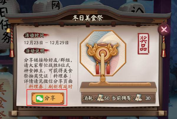 阴阳师最新的活动中,有着一个冬日美食祭的活动,这次的活动是要通过微信来参加的,玩法也是十分的简单,不过有的小伙伴还是找不到阴阳师美食祭的入口在哪里,那么阴阳师冬日美食祭的活动具体的玩法是怎样的,我们一起来详细的看一看吧。