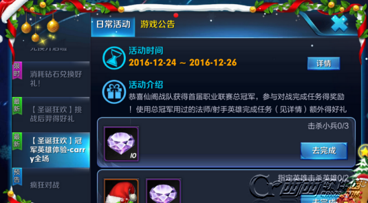 活动介绍:恭喜仙阁战队获得首届职业联赛总冠军,参与对战完成任务得奖励!使用总冠军用过的射手/法师英雄完成任务额外获得好礼。